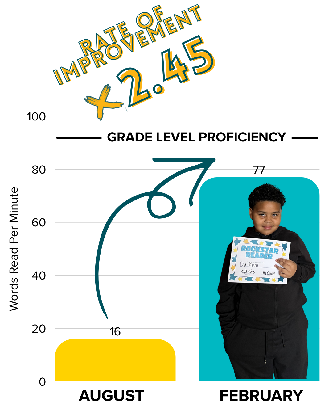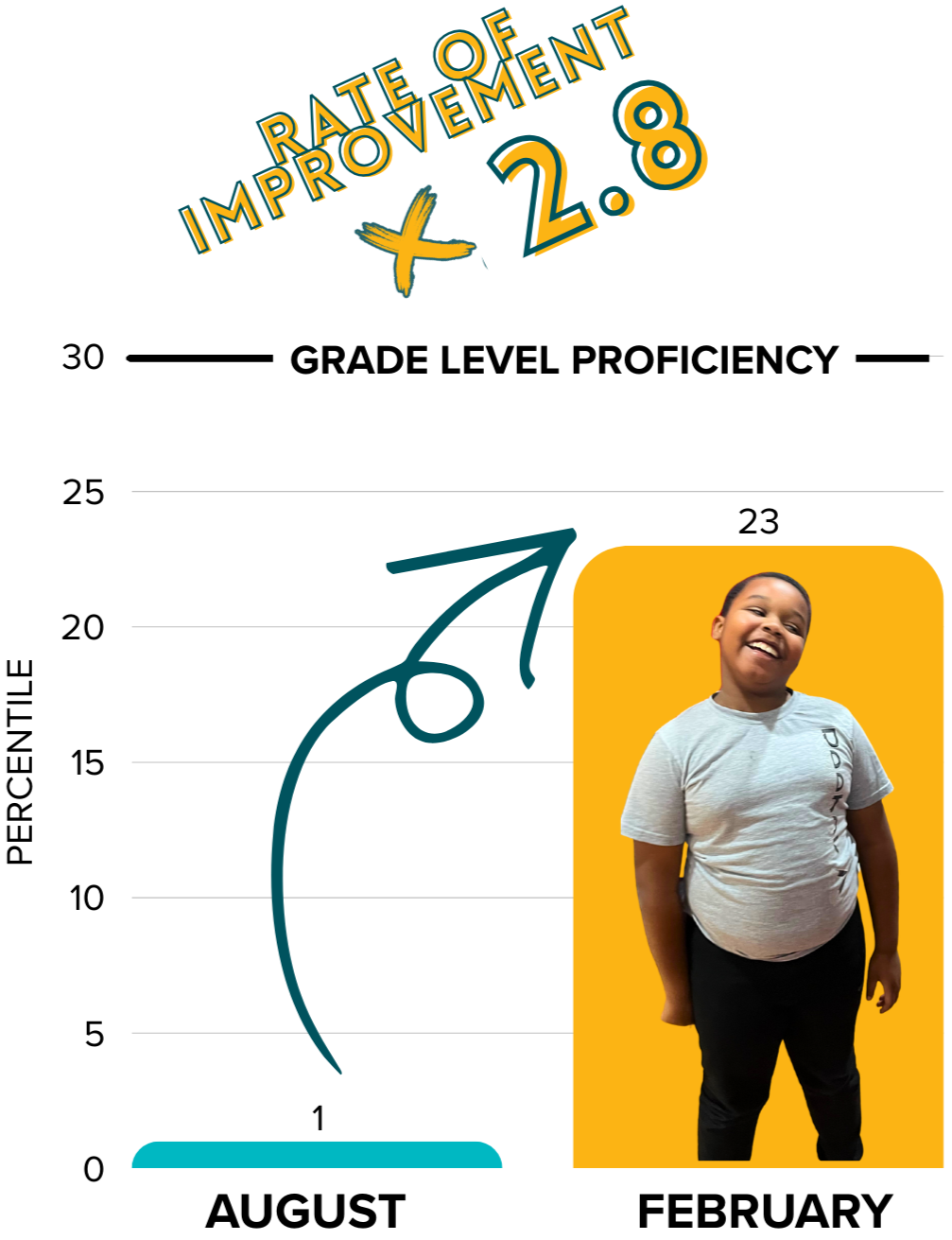 Now, he is projected to reach 120 words per minute by the end of the year, meeting the benchmark for his grade level and setting him up for success in fourth grade. This tremendous growth is the result of Da’Moni’s hard work, paired with our intentional, personalized, mastery-based approach to instruction. Without this targeted support, he would have remained two years behind in reading, and instead, he’s on track and thriving.